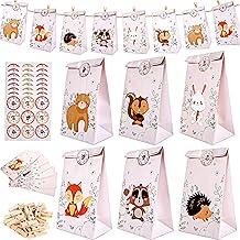 PROLOSO 24パック 動物パーティー記念品バッグ ステッカークリップ付き ロープ 森林 キャンディ お菓子バッグ ギフトバッグ 動物テーマ ベビーシャワー 誕生日パーティー用品 8スタイル